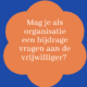 Nu nog die vrijwilligers zien te vinden voor je project, klus of actie. Dat kan door daar veel ruchtbaarheid aan te geven. Via de website, social media, via het lokale vrijwilligerssteunpunt, maar ook door op mensen af te stappen en te vragen of ze willen helpen. Misschien willen oud-vrijwilligers niks ‘structureels’ meer, maar wel ‘af en toe’ iets doen voor je organisatie? Het is zeker de moeite waard om ze daarnaar te vragen.