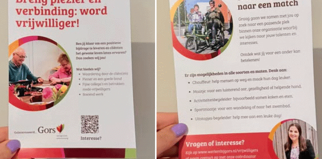 Vrijwilligerscoördinator Sharon van GORS uit Goes laat zien dat je simpel een actie kunt opzetten om nieuwe vrijwilligers te werven. Een flyer gecombineerd met online: